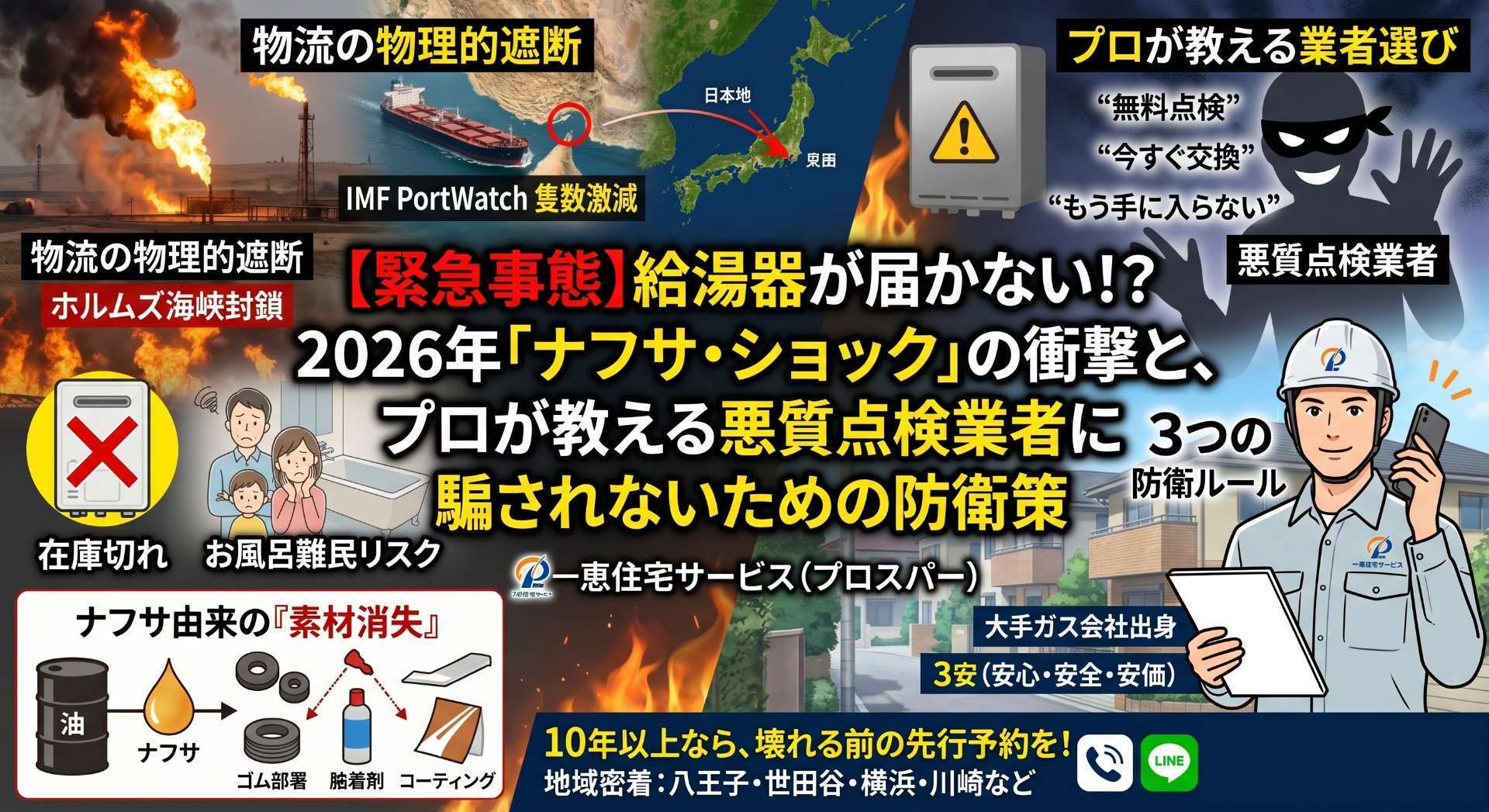 中東危機のニュースが連日報じられ、「給湯器が物理的に作れない」「在庫がなくなる」といった不安が広がる中、私たちプロが最も懸念しているのが、この社会不安を悪用する「悪質点検業者」や「不適切な訪問販売」の台頭です。