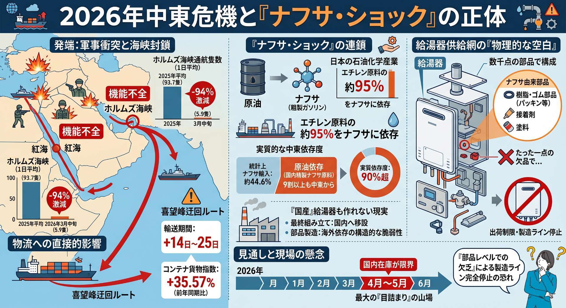 2026年4月現在、日本の給湯器供給網は、過去に類を見ない「物理的な空白」に直面しています。2月下旬に発生した軍事衝突により、世界の海上輸送の要衝であるホルムズ海峡と紅海が同時に機能不全に陥ったことが、すべての始まりでした。